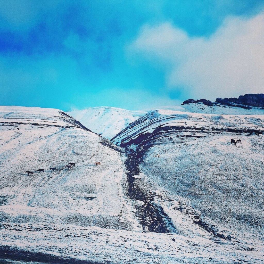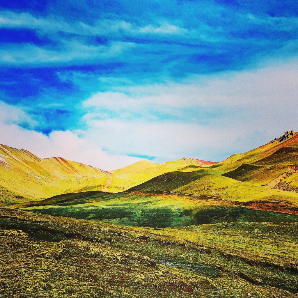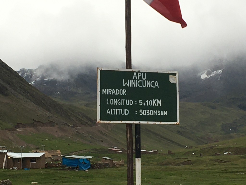 South of Cusco we started seeing signs of civilization again as we turned off to head up to rainbow mountain. There were tiny tiny little towns on this tiny one lane dirt road where one side was cliff up and the other side straight into a very roaring rocky river. Hubi had no problems. Tons of blind curves, just honked my way through, no oncoming traffic. Up and up and up we went until the towns stopped but the road continued and it’s condition getting worse and worse. Eventually we reached a huge parking lot, with a ghost tourist town on top. All restaurants and shops permanently closed. There was one farmer up there though, his dogs stayed outside our car all night. Parking lot was at 4480 meters. Cold night. Was snowing.